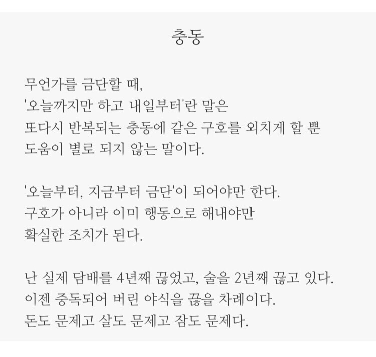 무언가를 금단할 때, '오늘까지만 하고 내일부터'란 말은 또다시 반복되는 충동에 같은 구호를 외치게 할 뿐 도움이 별로 되지 않는 말이다.