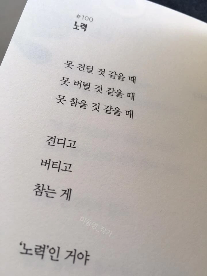 글쓰기 발상노트: 위 글(책 '문장의 위로')은 영화 <믿음의 승부> 중 Keep Going을 외치는 장면을 보고 여운이 남아 쓴 글귀이다. 우리는 '최선'이라는 한계를 너무 빨리 정해버린다. 할 수 없기 전까지는 절대 포기하면 안 된다. 왜? 할 수 있으니까. 계속 하는 것이 힘이다. 꾸준한 사람에게 행운은 깃든다.