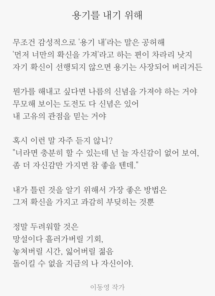 '먼저 너만의 확신을 가져'라고 하는 편이 차라리 낫지. 자기 확신이 선행되지 않으면 용기는 사장되어 버리거든.