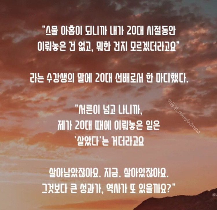 죽고만 싶었던 수많은 시련을 딛고 도전을 하면서 또 후회를 반복하면서 20대를 보낸 당신을 응원합니다. 30대는 훨씬 자유롭거든요. 근데, 더 빡세요 ㅋ 흘러 흘러 나도 모르는 사이 그 빡센 걸 즐기며 살게 돼요.