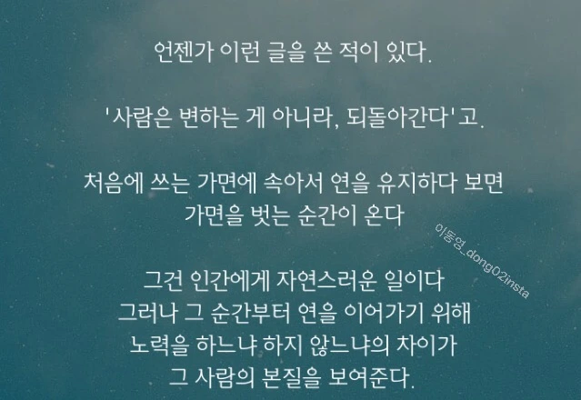고양이가 아닌 이상 한결같지 못한 건 인간에게 매우 자연스럽다. 그건 현상이다. 본질은 그가 연을 이어가기 위해서 노력하느냐, 뻔뻔하게 나오느냐로 상대가 정의 내리는 나와의 관계의 의미를 파악하는 일이다.