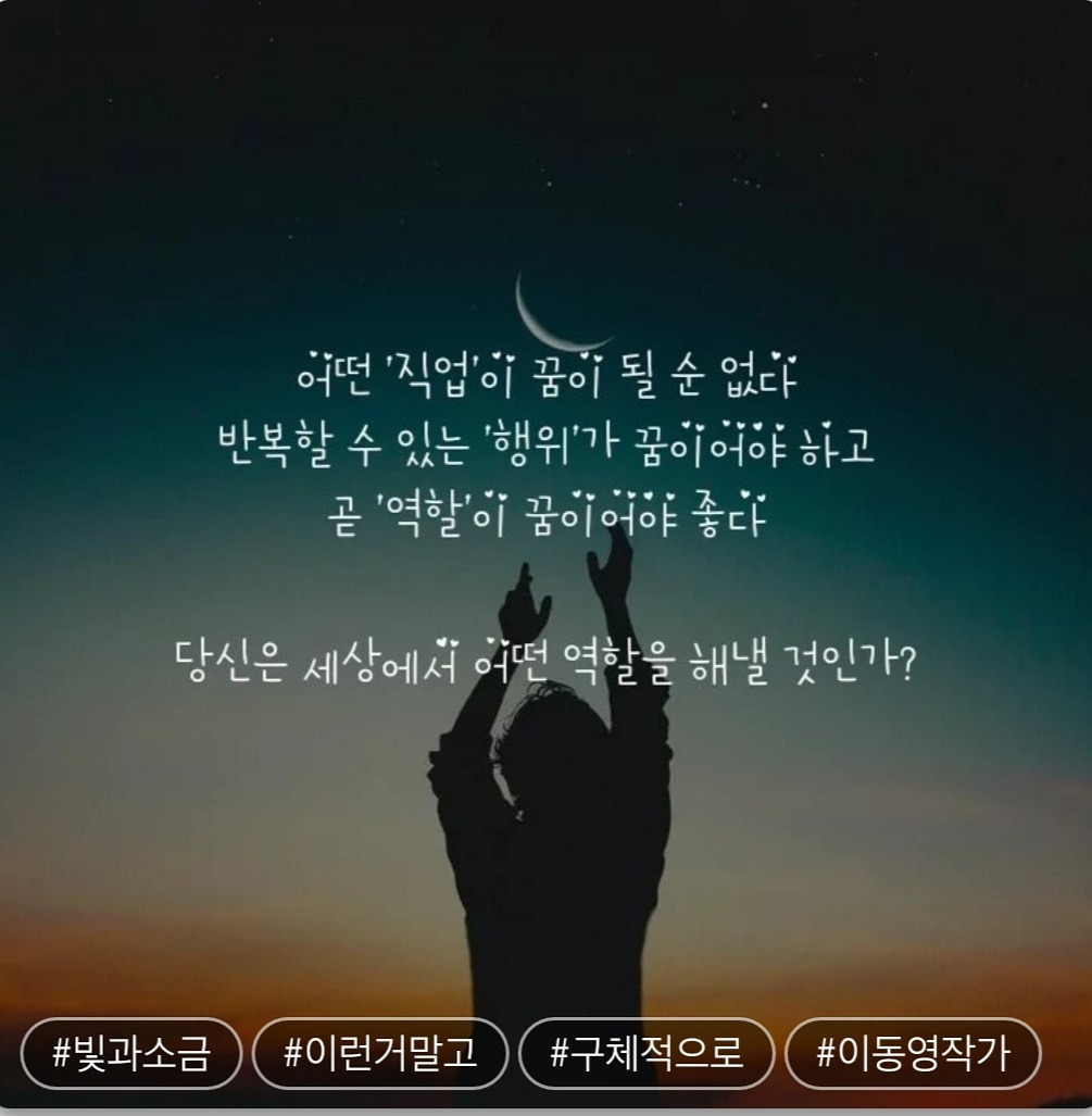 어떤 특정한 직업이 '꿈'이 되는 건 어색한 일이다. 반복할 수 있는 행위가 꿈이어야 하고, 곧 역할이 꿈이어야 좋다.