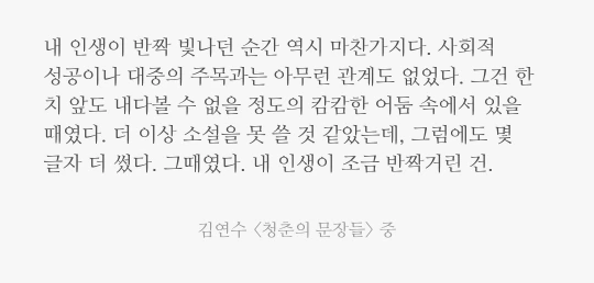 또한 내가 좋아하는 것은 글쓰기와 마찬가지로 무대(단상) 위에 올라 나를 바라보는 사람들에게 감화를 주는 일이다. 그래서 청중들의 눈빛과 리액션, 좋은 기운을 느끼는 걸 짜릿해 하는데, 나도 모르는 사이 그게 강사라는 직업으로 승화되었다.