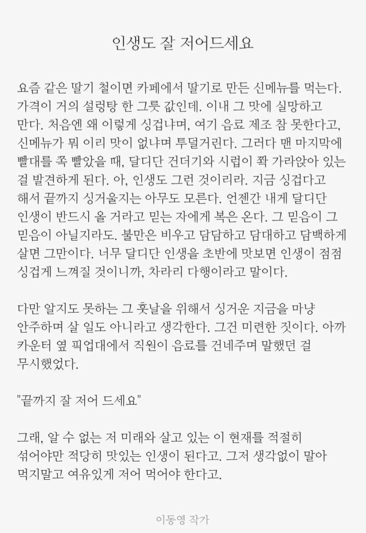 요즘 같은 딸기 철이면 카페에서 딸기로 만든 신메뉴를 먹는다. 가격이 거의 설렁탕 한 그릇 값인데. 이내 그 맛에 실망하고 만다. 처음엔 왜 이렇게 싱겁냐며, 여기 음료 제조 참 못한다고, 신메뉴가 뭐 이리 맛이 없냐며 투덜거린다. 그러다 맨 마지막에 빨대를 쪽 빨았을 때, 달디단 건더기와 시럽이 쫙 가라앉아 있는 걸 발견하게 된다.