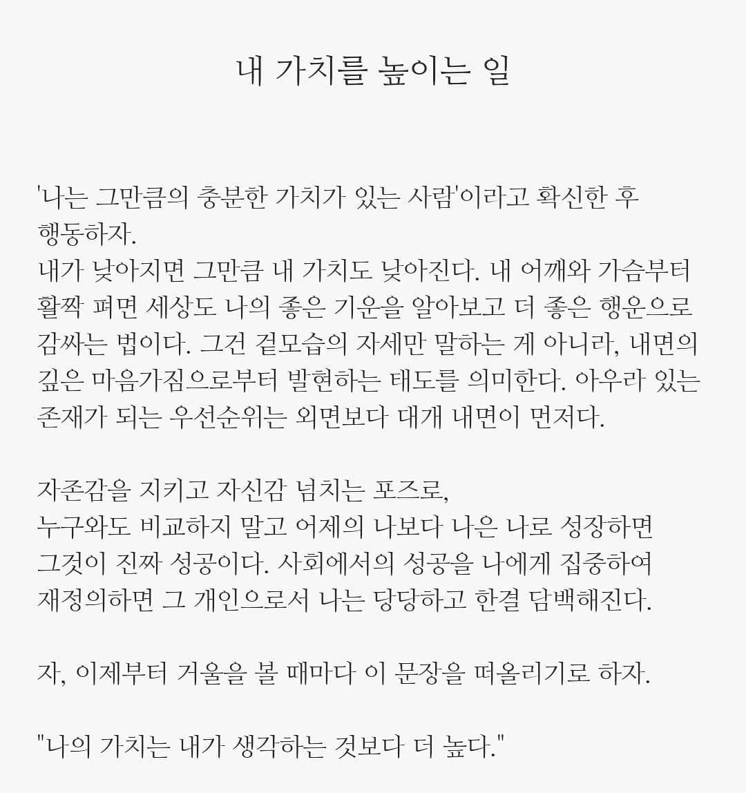 내 가치를 평가하는 건 세상일지라도, 내 가치의 기준점을 높이는 건 나 자신의 기준부터 시작한다.