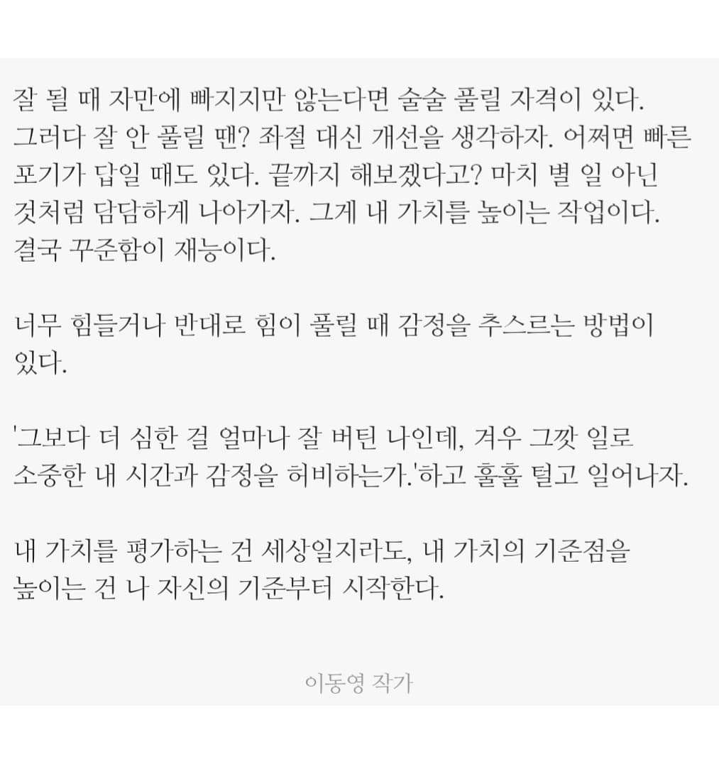 잘 될 때 자만에 빠지지만 않는다면 술술 풀릴 자격이 있다. 그러다 잘 안 풀릴 땐? 좌절 대신 개선을 생각하자. 어쩌면 빠른 포기가 답일 때도 있다. 끝까지 해보겠다고? 마치 별 일 아닌 것처럼 담담하게 나아가자. 그게 내 가치를 높이는 작업이다. 결국 꾸준함이 재능이다.
