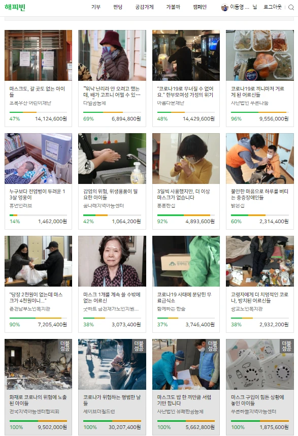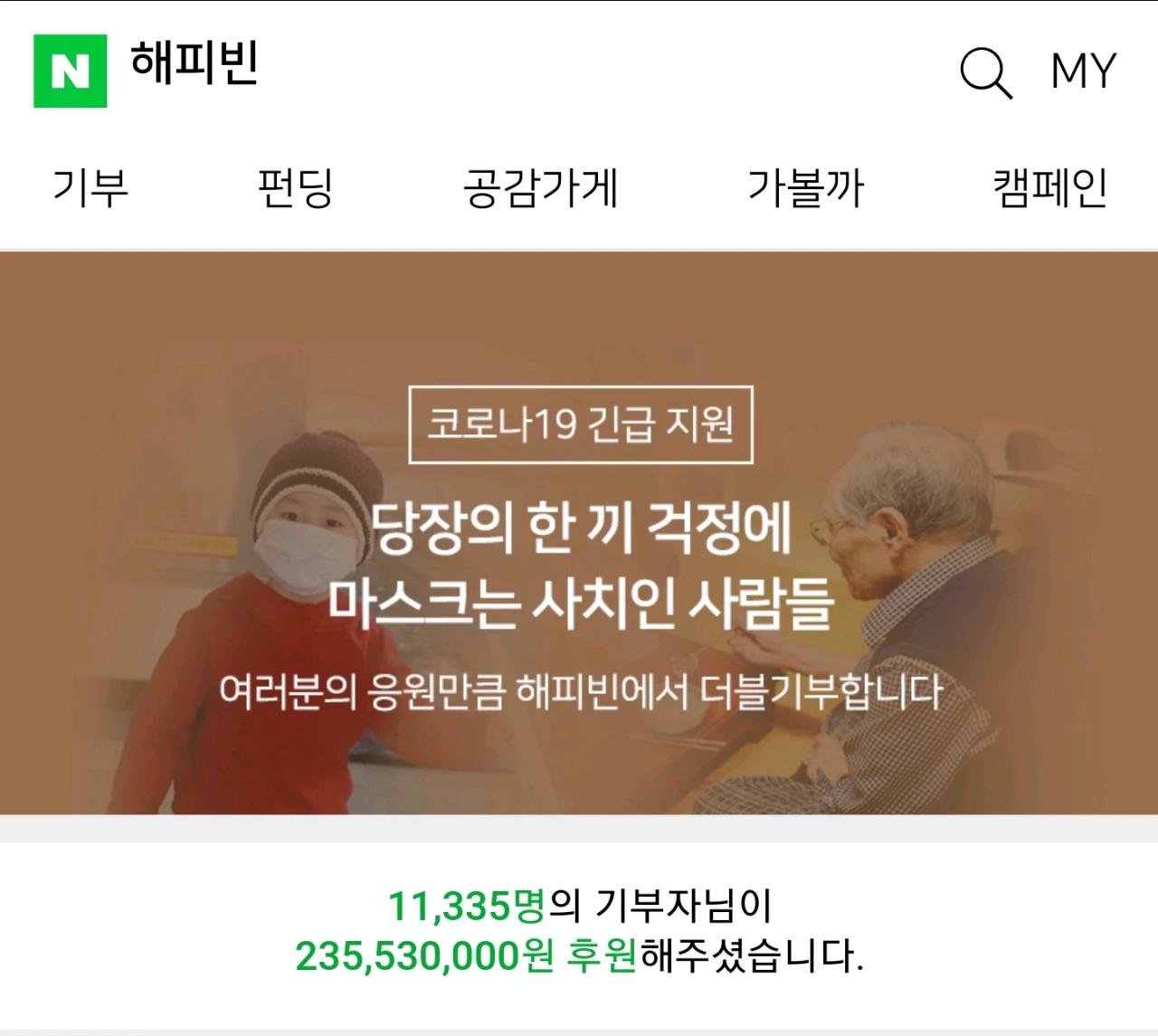 돈이 많아서 나누는 게 아니라, 마음으로 나누는 거죠. 클릭만 해도 받을 수 있는 단돈 100원이라도 저는 의미가 있다고 봅니다. 네이버 아이디가 있는 분이라면 해피빈 콩을 받아서 기부해보시는 건 어떨까요? 혹시 마음의 여유가 조금 있다면 결제 후 기부도 좋겠고요. 마스크를 구하지 못하는 이들에게 기부하는 건 곧 사랑을 나누는 것 이상으로 내 건강, 내 가족, 내 이웃, 우리나라를 함께 지키는 일이기도 하니까요 :)