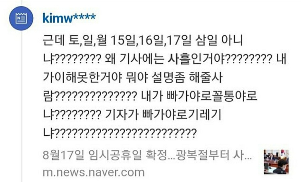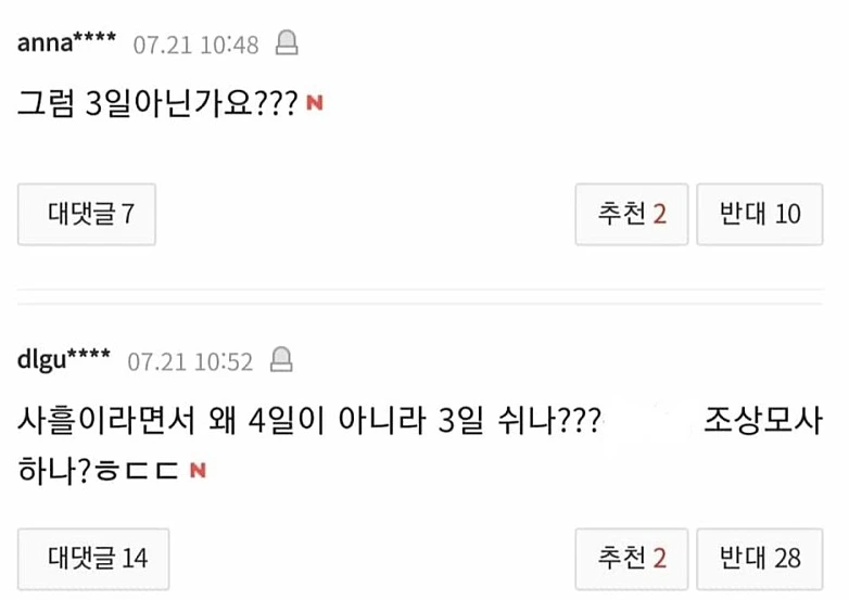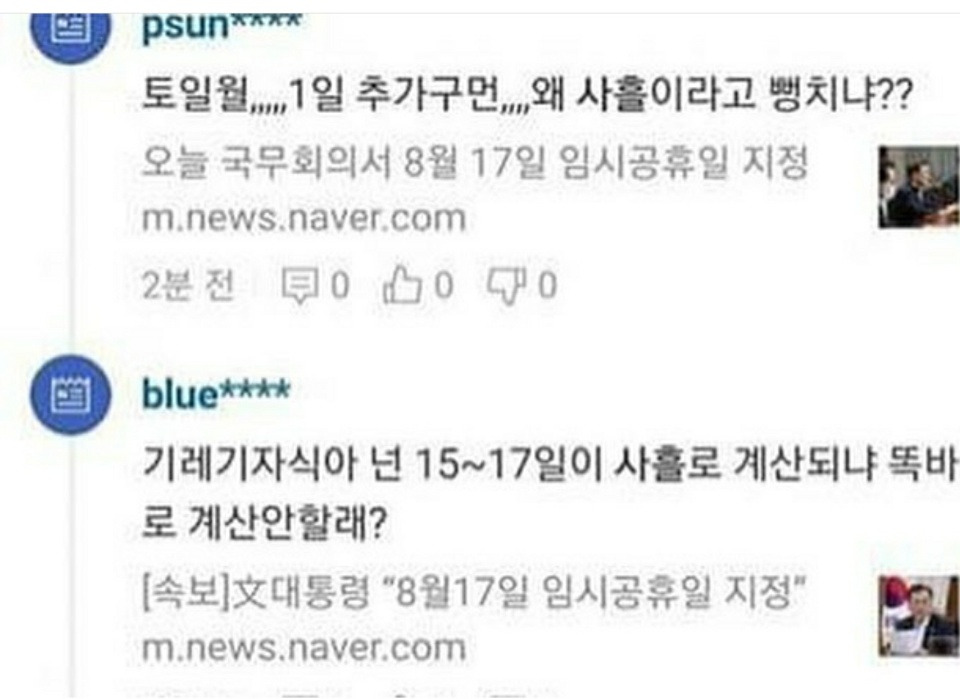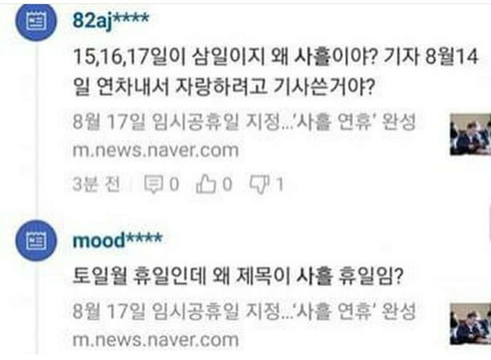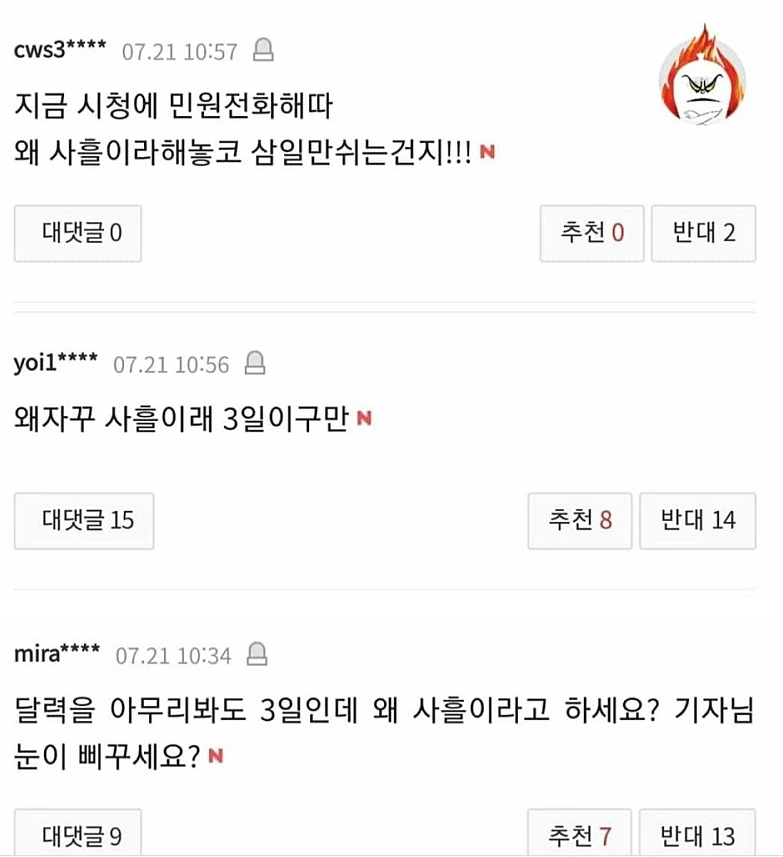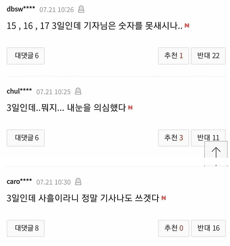 댓글이 기사 본문보다 하드캐리한 날. 사흘은 4일이 아니라 '3일'입니다