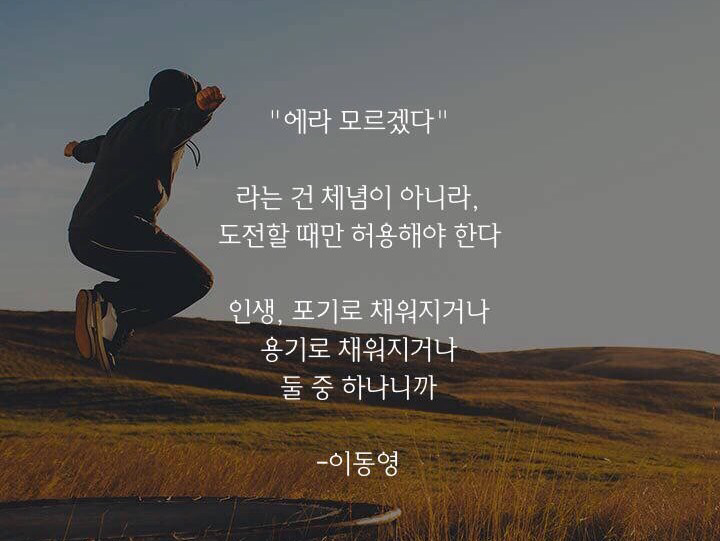 아씨!에다가 점 하나만 붙이면 아싸!가 되는 게 인생이란다. 점은 달리보는 '관점'을 말한다. 더 나은 방향을 찾고 그것을 향해 나아가기 위해 우리는 생각하고 도전하며 실패하거나 성공한다. 뭔가 잘 풀리지 않는 순간이 와도 늘 그래왔듯이 지나친 기대에 부풀어버린 실망보다 그 순간을 어떻게 '아싸!'하게 돌파해갈지, 앞으로 어떻게 '아싸!'로 만들어낼지 행위하는 거다. 그 행위에는 이미 아무것도 안하고 있지만 격하게 아무것도 하지 않으며 푹 쉴 수도 있고, 바닥을 짚고 일어나 껑충 세상 밖으로 나오는 담대함일 수도 있다.