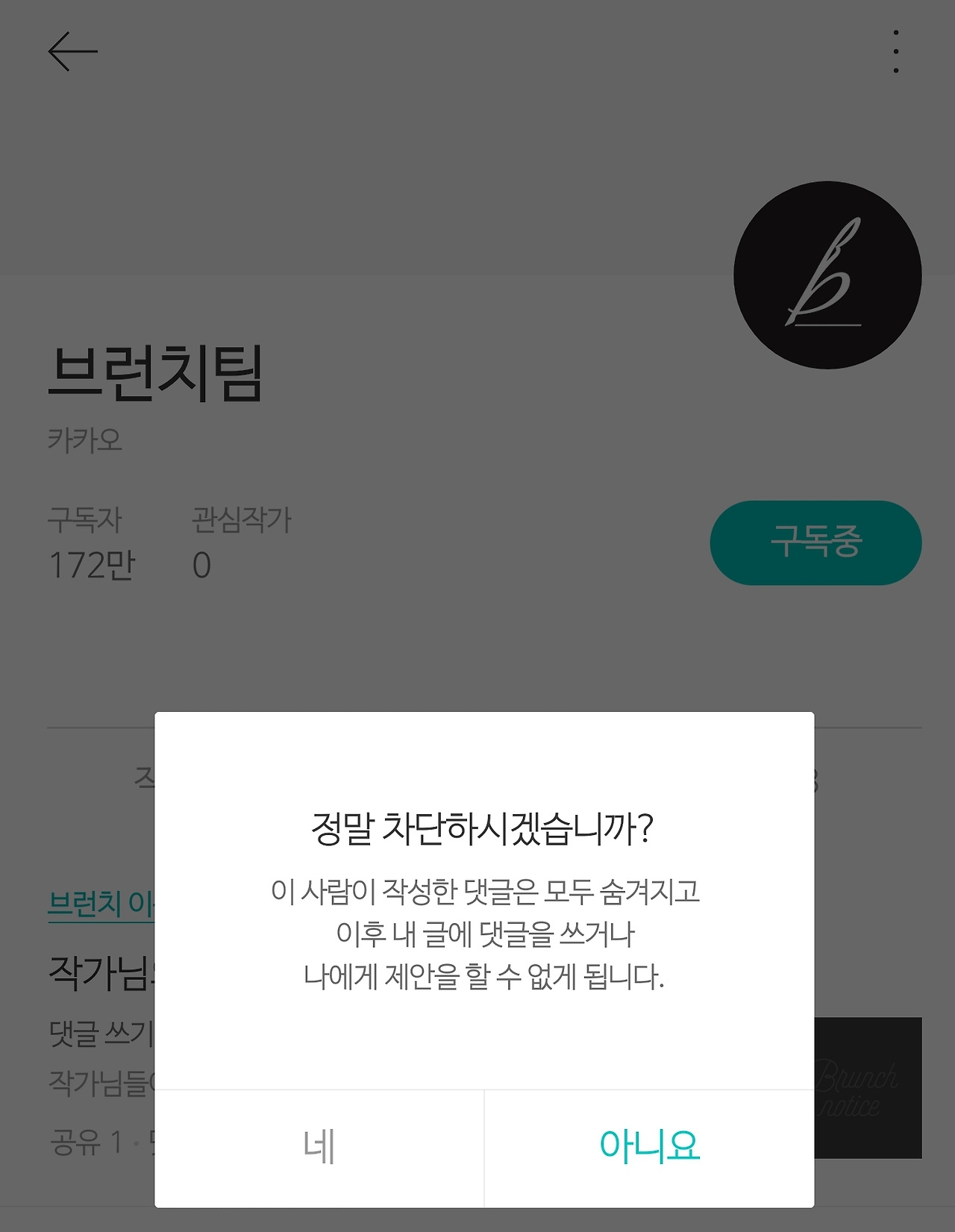 댓글 쓰기 허용 기능과 유저 차단 기능 추가 안내 | 브런치는 작가님들이 지속적인 창작 활동을 펼칠 수 있는 환경을 만들기 위해 노력하고 있습니다. 이에는 글과 작품을 완성하기 위한 완성도