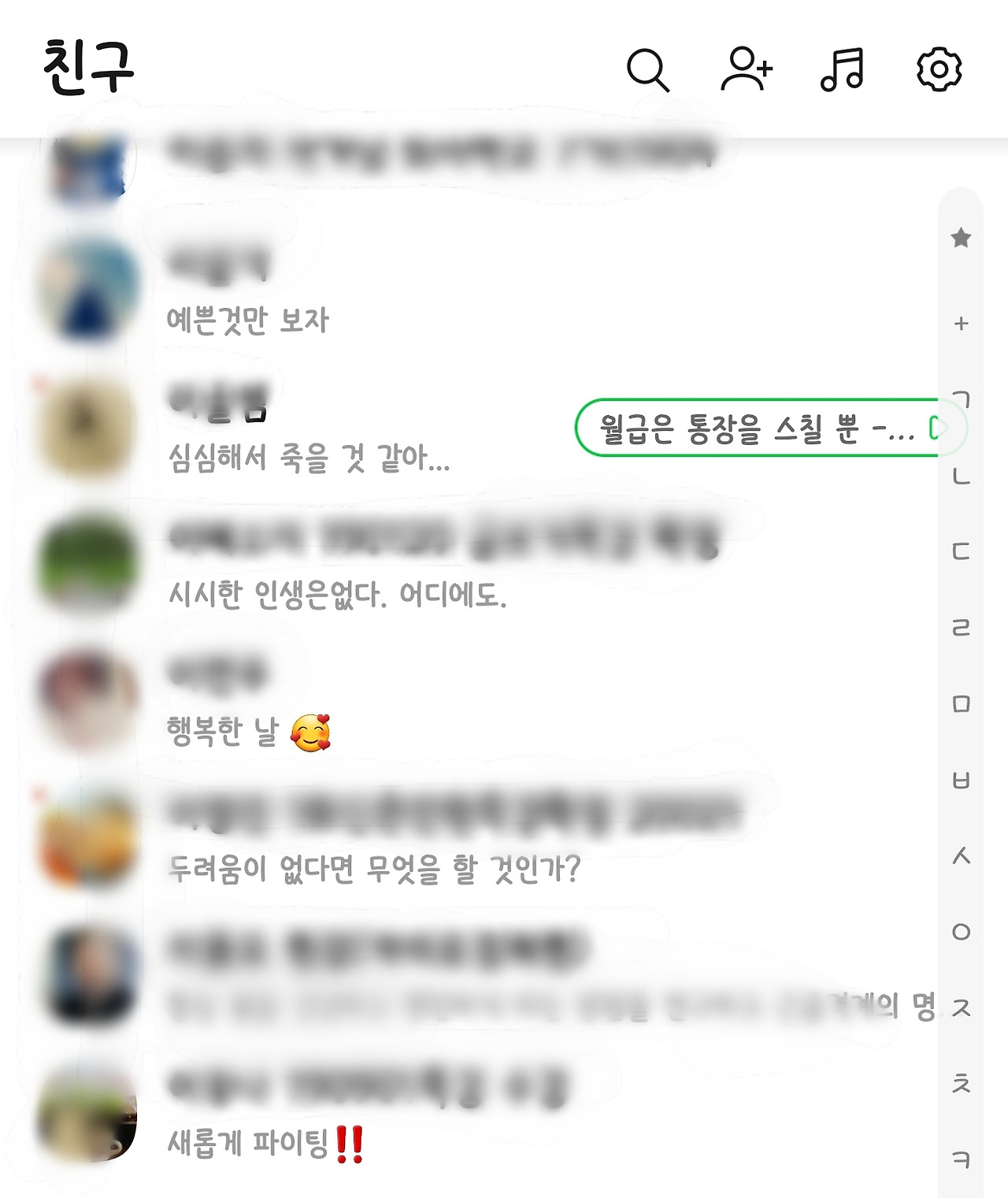 카톡 메시지는 일종의 작은 가면인 셈이다. 그래서 '감사, 파이팅, 시작'-처럼 자신에게 외치는 듯한 긍정 말투가 많다. 혹은 프사에 아이들이나 부모님 사진을 올려놓고 상메에는 '보물들'이나 '내 전부(하트)' '사랑합니다'와 같은 글을 올려놓기도 한다. 이런 상메를 더 많이 보는 사람은 아이러니하게도 타인들, 날 카톡에 저장한 사람들이다.