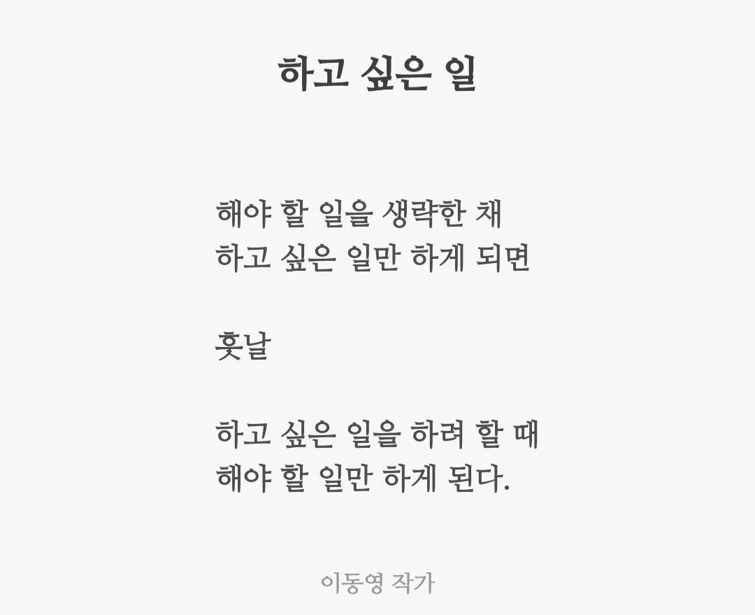 다시 태어난다는 마음으로 오늘 시작하면 이룰 수 있는 게 이중 절반이 넘는다. 그 말은 내가 하루를 제대로 살고 있지 않다는 말과 같다. (이룰 순 없겠지만 외모만은 원빈으로 하루만이라도 살고 싶다. 하루를 제대로 살 것 같다.오히려 그런 건 우선순위가 아니었다.) 건강하고 체력 좋고 지금부터 몰입을 한다면 충분히 해낼 수 있는 것들이 많다.