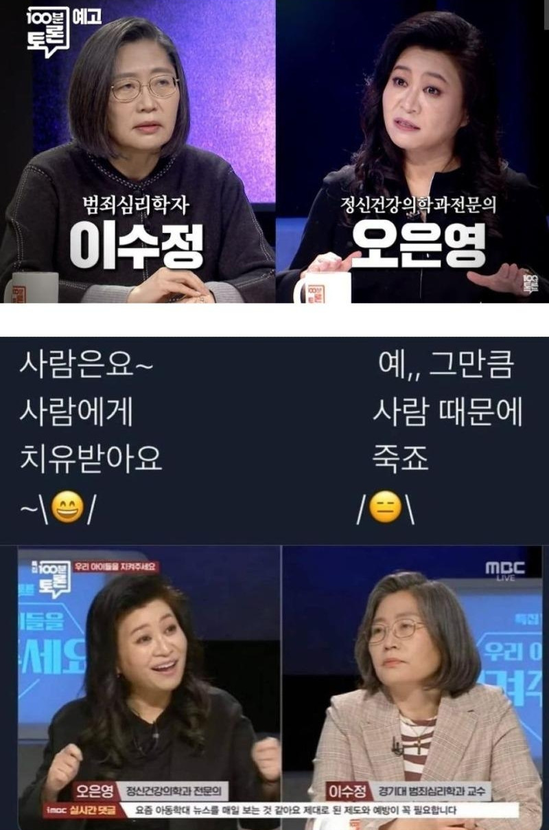 요즘 유행하는 밈 중에 하나로 오은영 Vs. 이수정 100분 토론 명장면을 보자.