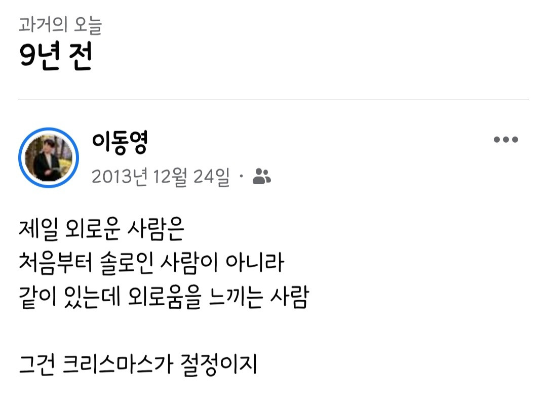 온라인, 특히 SNS 분위기는 '크리스마스에 뭐 하냐'며 자기는 행복하다는 걸 친구, 연인, 가족 등과 인증하지만 뭐 그것도 그들 나름대로의 결핍과 과잉이 어떤 이유와 어우러진 결과물일 테니까요.