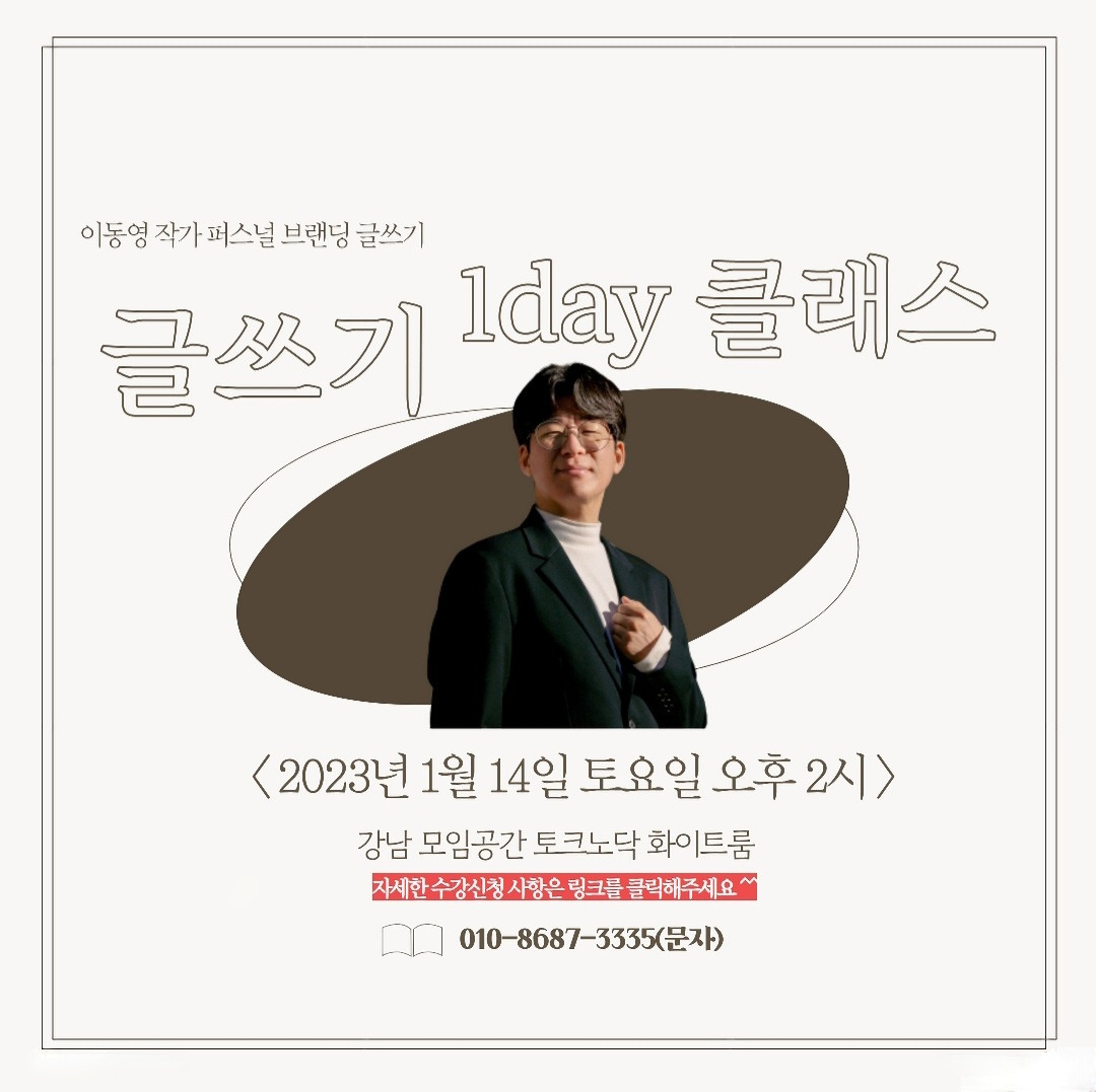 [선착순]23.01.15(일) Zoom 온라인 글쓰기 특강! with 이동영 작가 ★본 사전질문 제출은 본 강의 수강시 강의안 저작권 보호(촬영, 녹음 등 금지)에 동의함으로 간주합니다. ✔️일시: 2023년 01월 15일(일) 14시~16시 (쉬는시간 포함 최대 120분) ✔️장소: Zoom 온라인