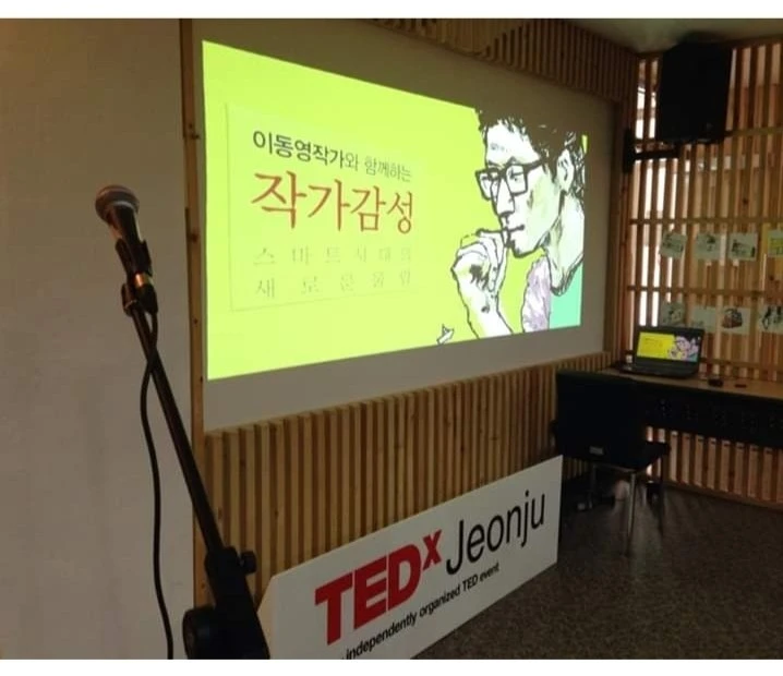 '작가감성, 스마트 시대의 새로운 울림'이라는 제목의 명강연이었는데요. TED의 취지에 맞지 않게 영상이 퍼지진 않았어요. 저를 추천해 준 오거나이저가 제 강연이 시작되기 전에 다른 사정으로 그만두게 되었고, 대대적인 홍보가 이뤄진 덕분에 저는 변경 없이 강단에 오르게 되었지만 어린 대학생 스텝들이 영상을 올리질 않았던 겁니다.