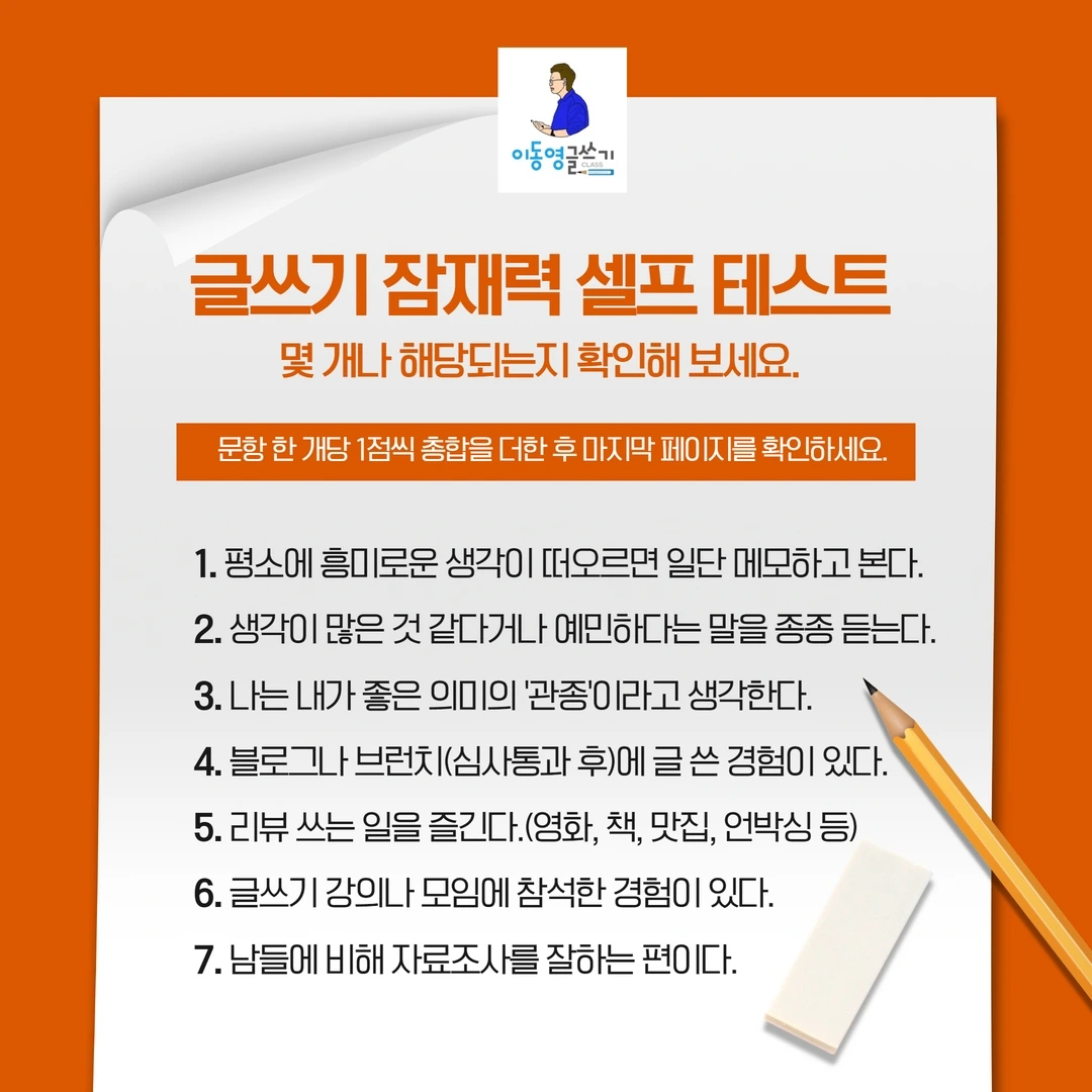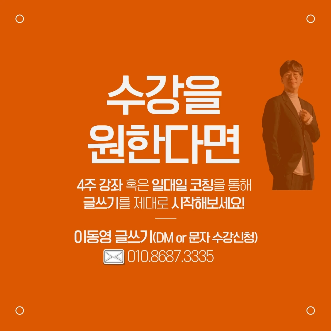[선착순]글쓰기 클래스 온라인 with 이동영 작가 ★본 사전질문 제출은 본 강의 수강시 강의안 저작권 보호(촬영, 녹음 등 금지)와 환불정책, 온라인 수강 시 카메라 ON에 동의함으로 간주합니다. 나를 발견하는 30일 글쓰기(온라인) ✔️일시: 23