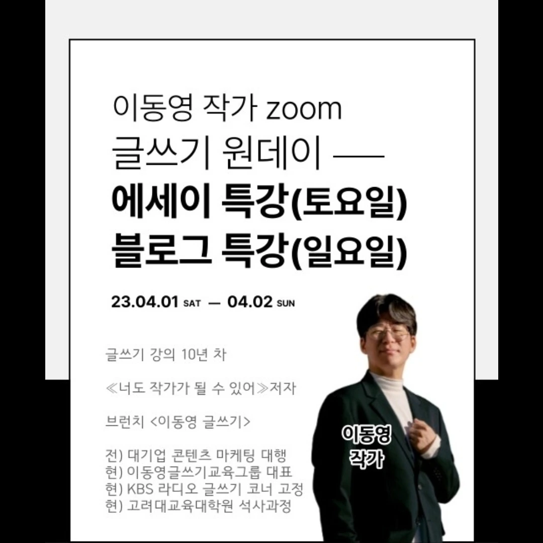 [선착순] 에세이 글쓰기 기본 Zoom 특강 with 이동영 작가 ★본 사전질문 제출은 본 강의 수강시 강의안 저작권 보호(촬영, 녹음 등 금지)와 환불정책, 온라인 수강 시 카메라 ON에 동의함으로 간주합니다. 이동영 강사는 소수정예 강의를 선호하며, 밀도