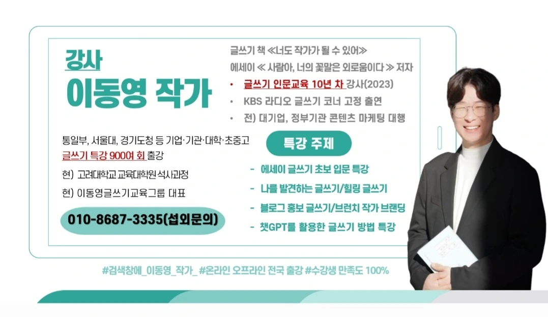 글쓰기 강사 | 이동영 작가 | 글쓰기 강의 12년 차(2025) | 기업·대학 등 1000여 회 출강 | 에세이 특강 | 홍보 글쓰기 Lhh2025@naver.com(강의·방송)