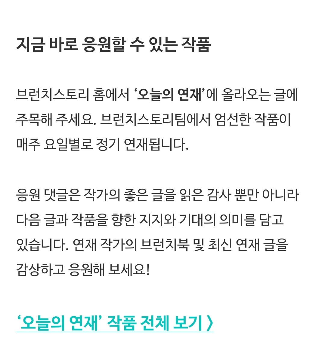 A. 현재는 일부 브런치 작가의 연재 작품을 대상으로 (브런치스토리 팀이 엄선)파일럿 테스트 중이고 차츰 확대 적용할 예정이라고 합니다.