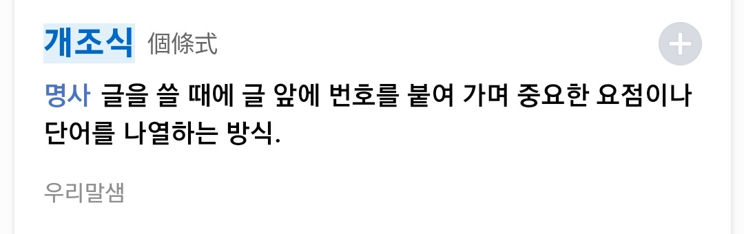 그래도 흔히 쓰는 말이라 개방형 사전에는 있다. 특히 직장에서 보고서 작성이나 PT(프레젠테이션)할 때 쓰인다. 글 앞에 번호를 매겨서 중요한 요점이나 단어 등을 나열하는 방식, 현장에서는 개조식이라고 말한다.