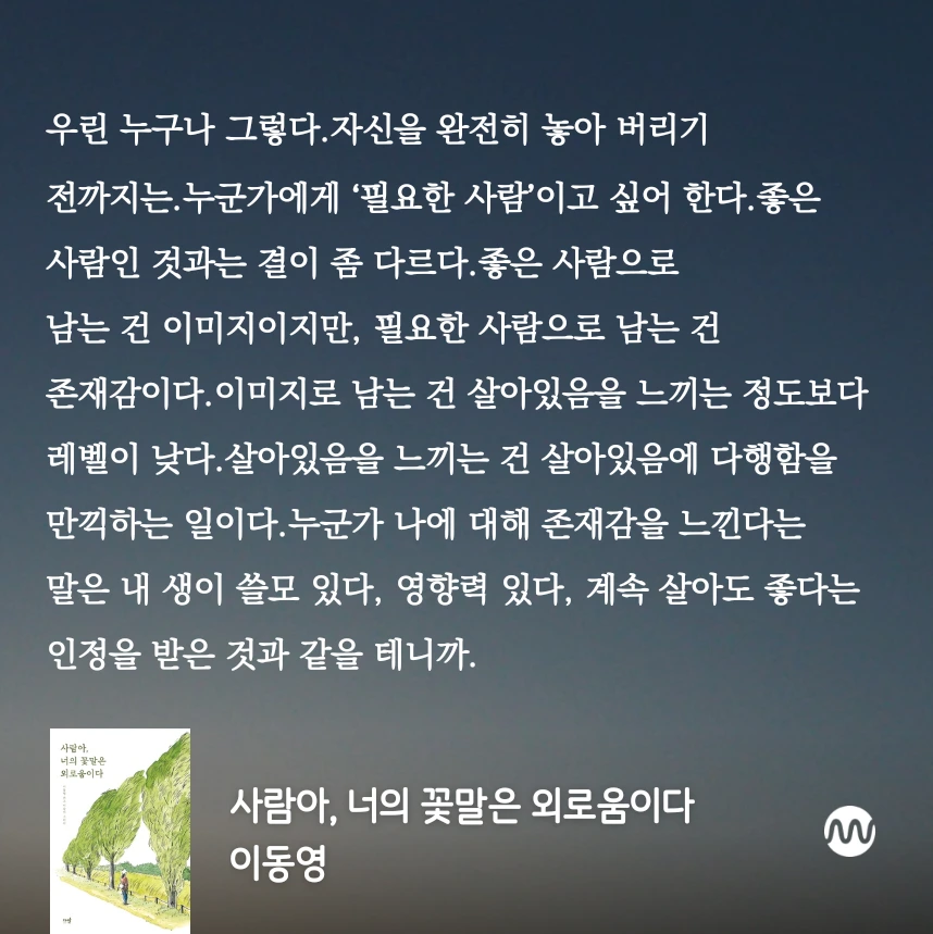 우린 누구나 그렇다. 자신을 완전히 놓아 버리기 전까지는. 누군가에게 ‘필요한 사람’이고 싶어 한다. 좋은 사람인 것과는 결이 좀 다르다. 좋은 사람으로 남는 건 이미지이지만, 필요한 사람으로 남는 건 존재감이다. 이미지로 남는 건 살아있음을 느끼는 정도보다 레벨이 낮다. 살아있음을 느끼는 건 살아있음에 다행함을 만끽하는 일이다. 누군가 나에 대해 존재감을 느낀다는 말은 내 생이 쓸모 있다, 영향력 있다, 계속 살아도 좋다는 인정을 받은 것과 같을 테니까.