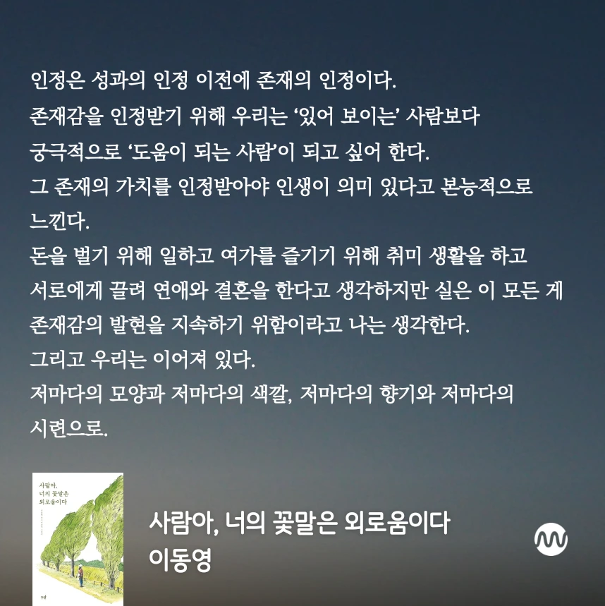 인정은 성과의 인정 이전에 존재의 인정이다. 존재감을 인정받기 위해 우리는 ‘있어 보이는’ 사람보다 궁극적으로 ‘도움이 되는 사람’이 되고 싶어 한다. 그 존재의 가치를 인정받아야 인생이 의미 있다고 본능적으로 느낀다. 돈을 벌기 위해 일하고 여가를 즐기기 위해 취미 생활을 하고 서로에게 끌려 연애와 결혼을 한다고 생각하지만 실은 이 모든 게 존재감의 발현을 지속하기 위함이라고 나는 생각한다. 그리고 우리는 이어져 있다. 저마다의 모양과 저마다의 색깔, 저마다의 향기와 저마다의 시련으로.