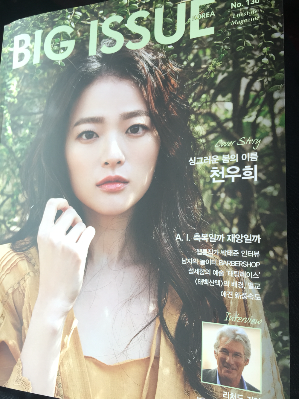 *빅이슈는 홈리스(노숙인 등 주거 취약 계층)에게만 잡지 판매권한을 주어서 50%의 수익금과 함께 임대주택 등 안정된 자립기반을 확보해주는 대중문화잡지이다. 영국에서 창간해 세계적 스타들은 물론 예술가들의 재능기부로 만들어지며, 표지모델 역시 100% 재능기부로 이루어진다.