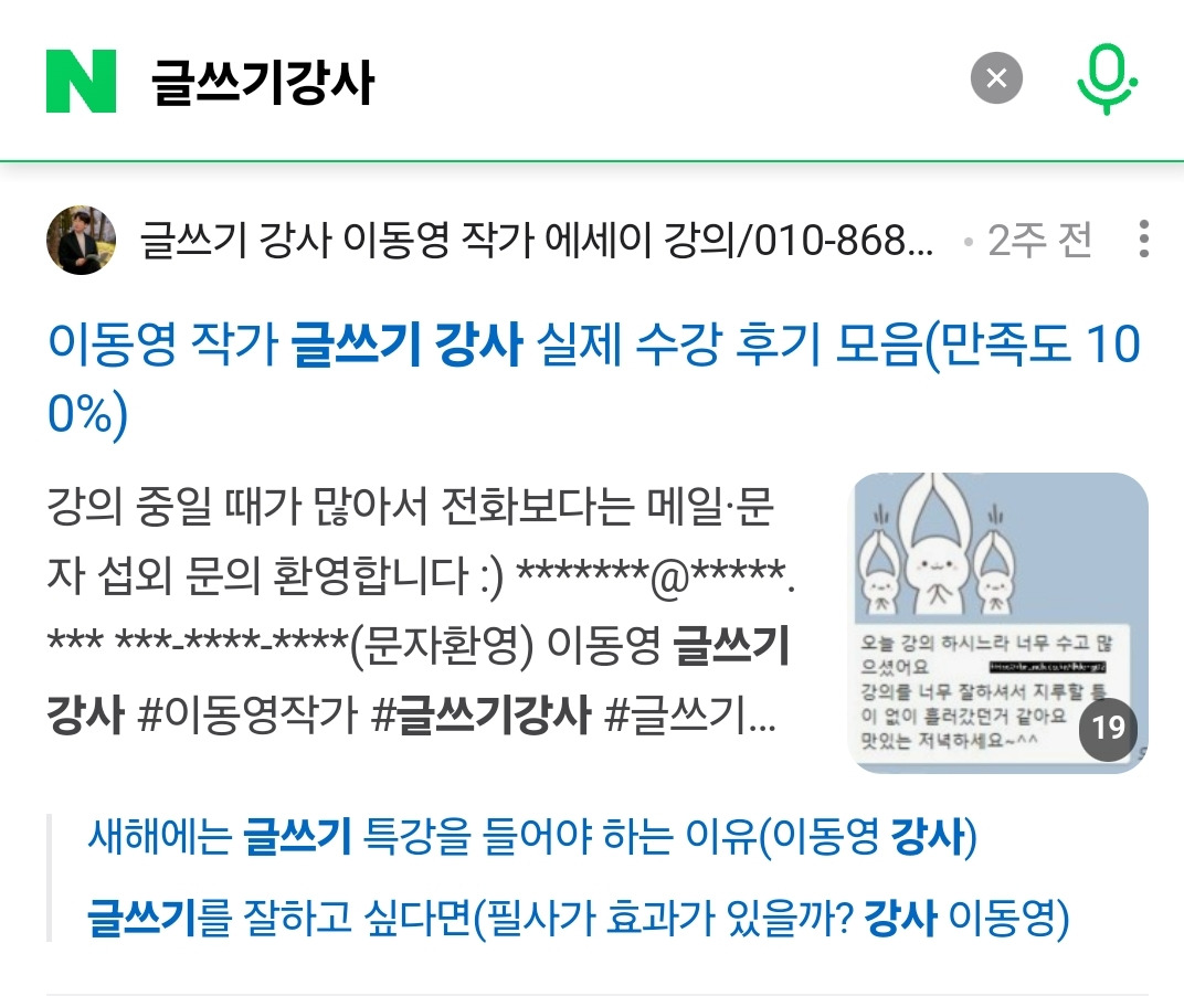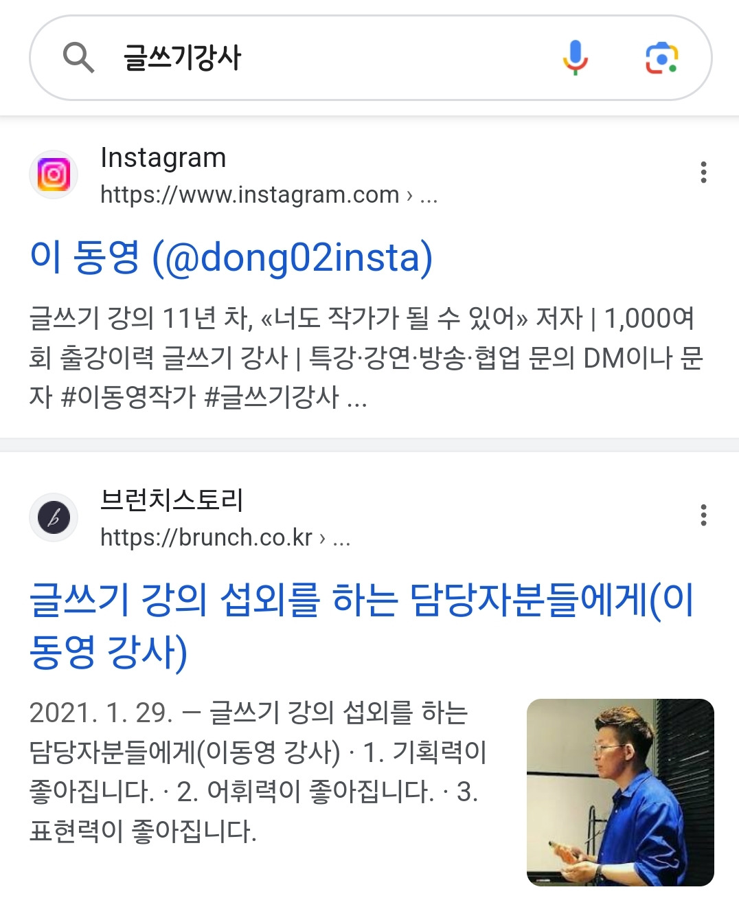 현재 KBS 방송, 기업 정기 출강, 전 연령 대상 출강은 95% 이상 섭외 되는 경로가 제 블로그(이동영 글쓰기 강사)입니다.