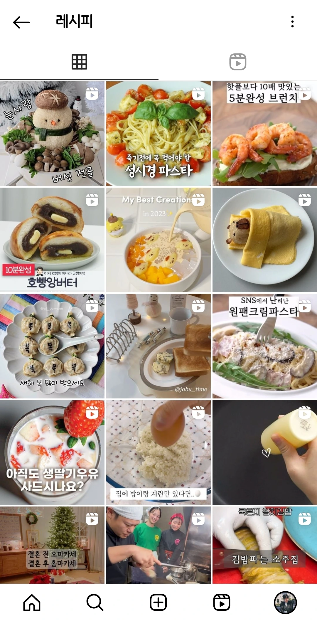최근 나에게 가장 많이 보이는 건 짧은 레시피 영상이다. 여자친구에게 요리를 해주겠다는 일념 하에 차곡차곡 레시피를 모으고 있는 중이기 때문이다. 가령 라이스페이퍼를 사용한 호떡이라든지 눈사람 버섯전골, 원팬 크림파스타 등등이다. 내가 좋아요를 누르거나 저장하거나 재생 후 오래 머문 영상과 비슷한 영상이 알고리즘에 의해 내 계정 피드에 맞춤으로 뜬다.