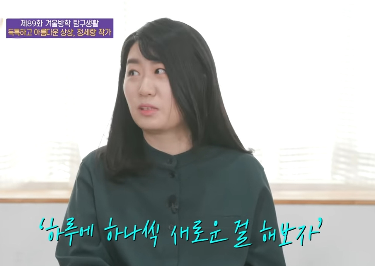 SF 소설 작품을 많이 낸 정세랑 작가는 독특한 상상력의 비결로 '하루에 하나씩 새로운 일을 해보자'라는 다짐을 꼽았습니다. 평소 안 먹어본 새로 나온 과자를 먹고, 평소 안 가본 길로 산책 경로를 바꿔본다거나 평소 안 읽었던 영역의 책을 읽는 식으로 실천한다고 합니다.
