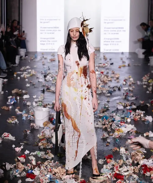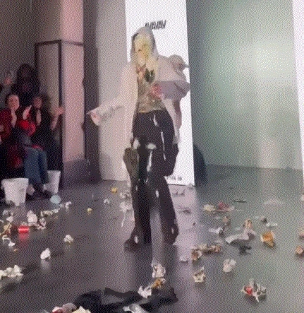 이탈리아 패션 브랜드 ‘AVAVAV’의 크리에이티브 디렉터이자 디자이너 베아테 칼손이 선보인 ‘쓰레기 퍼포먼스’는 온라인상에 무분별하게 쏟아지는 악플을 꼬집었다.