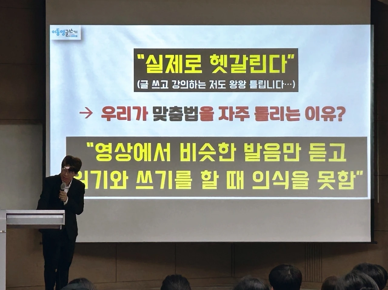 물론 그에 앞서 여러 가지 맞춤법 사례와 구분 방법을 알려주고, 맞춤법 자가 테스트도 진행했고요. 무엇보다 짧은 영상을 접하며 직관적으로 받아들이는 세대에게 가장 중요한 게 무엇일까 고민했어요. 제 결론은 맥락적인 문장을 읽고 쓰는 걸 통해서 표준어 맞춤법을 익히자는 것이었고, 이 점을 핵심으로 역설했습니다.