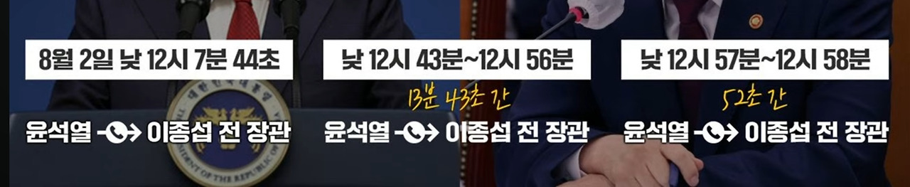 ((+이첩하던 시간대에, 윤석열 대통령 개인 휴대폰으로 8월 2일 이종섭 국방장관과 3차례 연속 통화한 기록이 확인 되었다.))