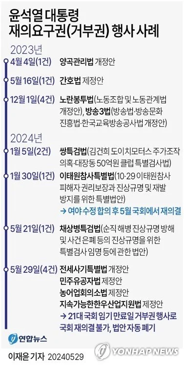 5월 21일, 대통령은 채상병 특검법(순직 해병 진상규명 방해 및 사건 은폐 등의 진상규명을 위한 특별검사 임명법) 에 재의요구권(거부권)을 행사했다.