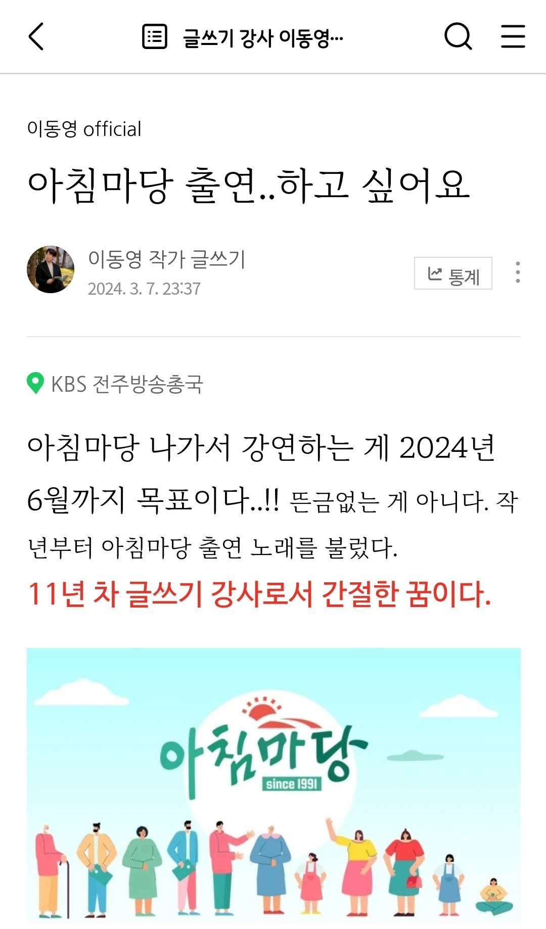 놀랍게도 '방송의 날 시청자주간 특집'이 아침마당 전북에 편성되었다. 다른 패널들은 재출연이거나 고정패널의 가족이자 방송인이었는데, 나만 TV 첫 출연이었다. 나는 꼭 나를 위해서 만들어진 특집 같았다.
