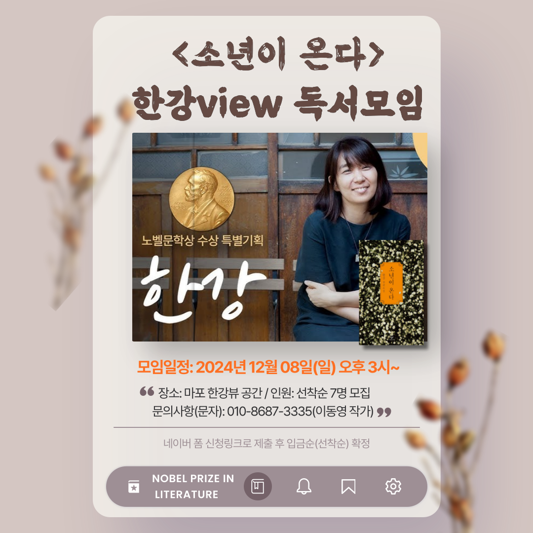 12월 수상식을 앞둔 주말에, 한강이 보이는 공간에서 독서모임을 엽니다.