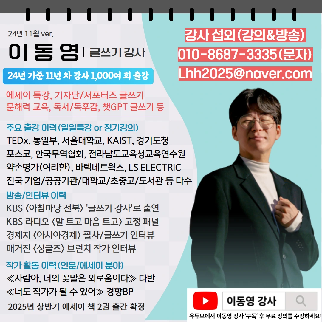 이동영 작가는 11년 차(2024년) 유명한 글쓰기 강사이다.