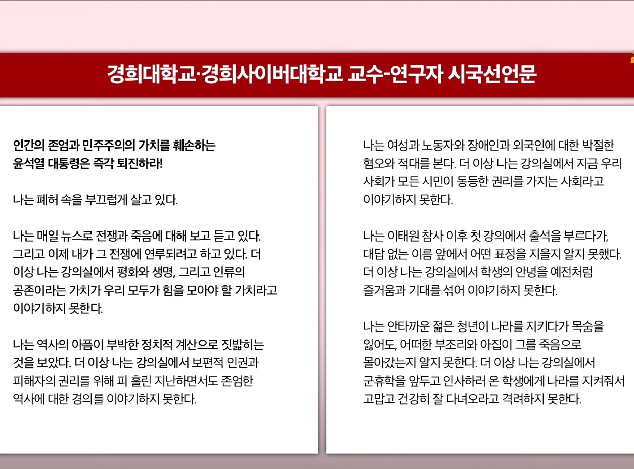 ▲ 경희대 시국선언문 주요 문장 ⓒ 임병도 "나는 폐허 속을 부끄럽게 살고 있다." 지난 13일 경희대·경희사이버대 교수-연구자 226명이 발표한 시국 선언문의 첫머리에 나오는 말입니다. 전국 각