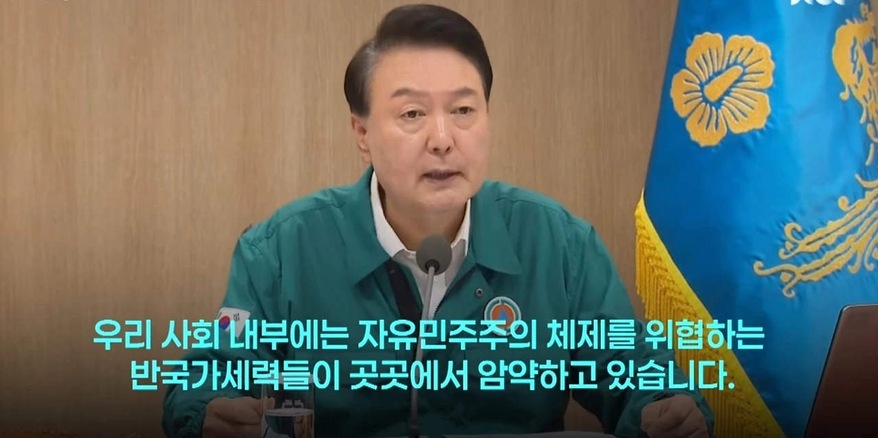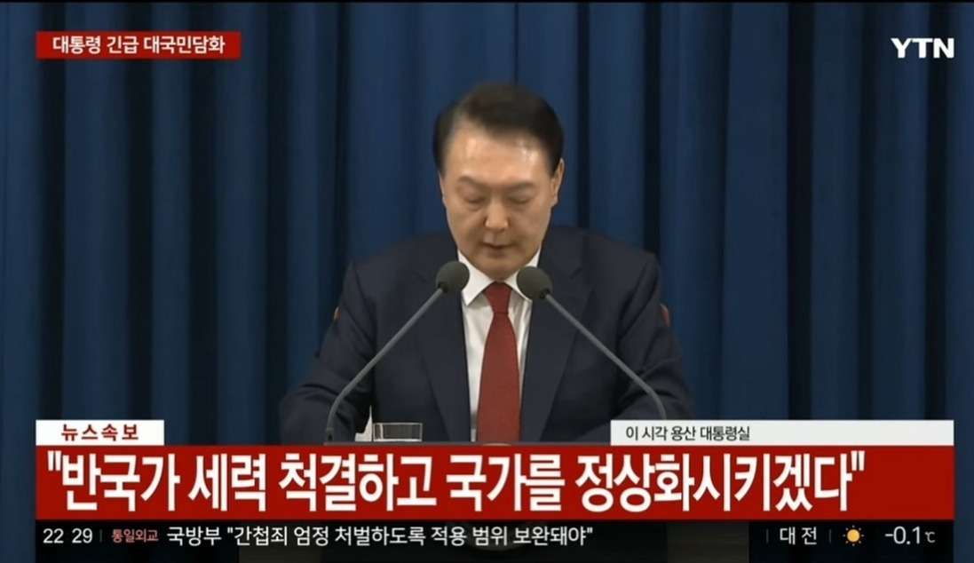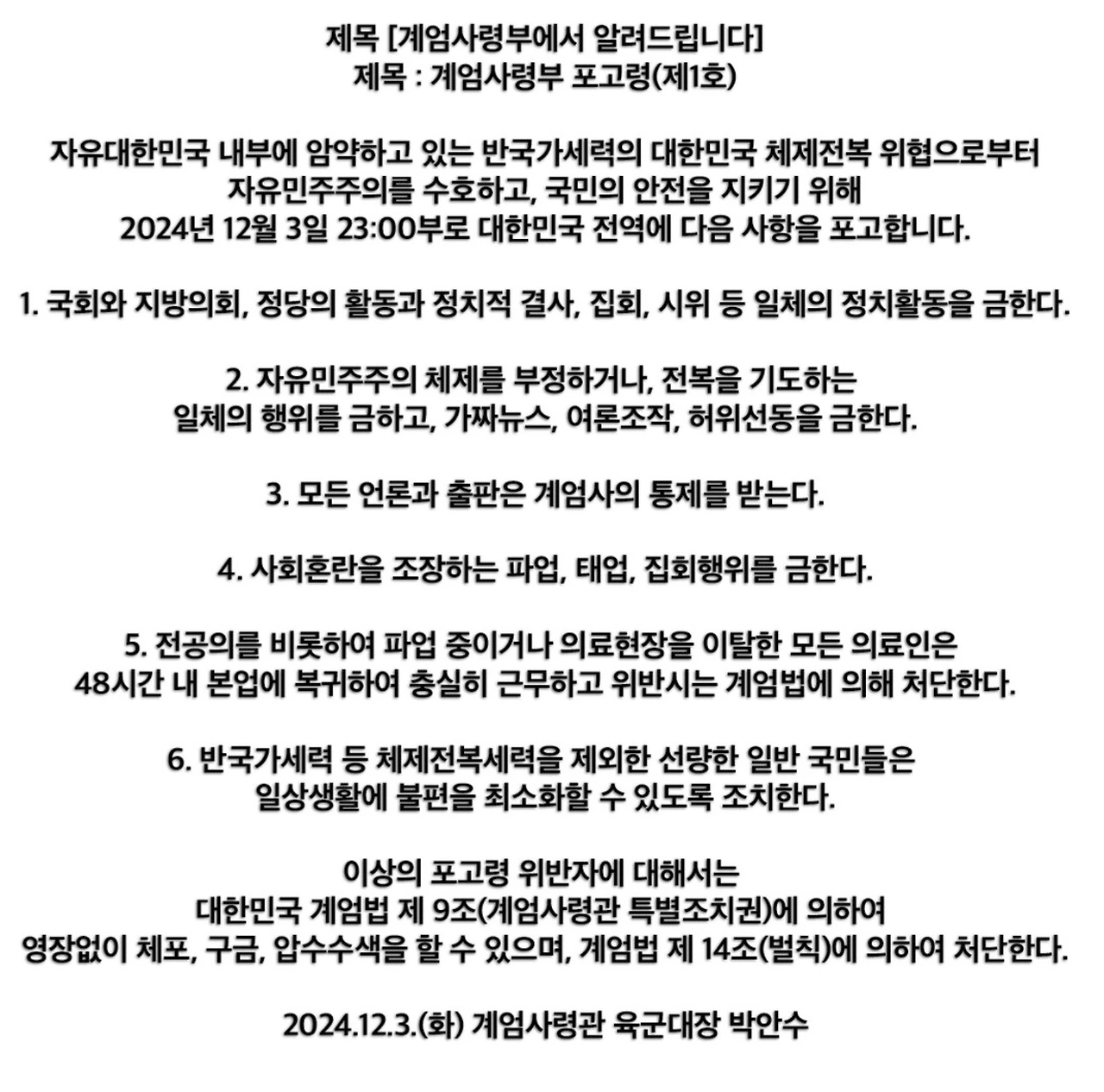 자유대한민국 내부에 암약하고 있는 반국가세력의 대한민국 체제전복 위협으로부터 자유민주주의를 수호하고, 국민의 안전을 지키기 위해 2024년 12월 3일 23:00부로 대한민국 전역에 다음 사항을 포고합니다.