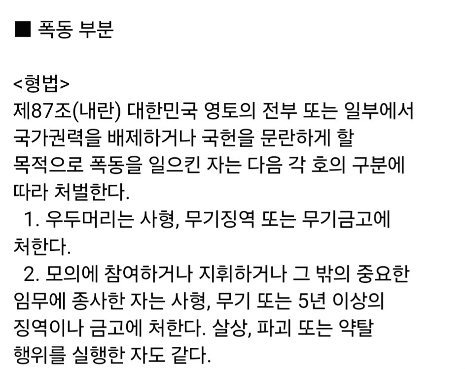 - 형법 제87조(내란)의 구성요건인 폭동의 내용으로서의 폭행 또는 협박은 일체의 유형력의 행사나 외포심을 생기게 하는 해악의 고지를 의미하는 최광의의 폭행·협박을 말하는 것으로서, 이를 준비하거나 보조하는 행위를 전체적으로 파악한 개념이라고 할 것이다. (대법원 1997. 4. 17. 선고 96도3376 전원합의체 판결 참조)