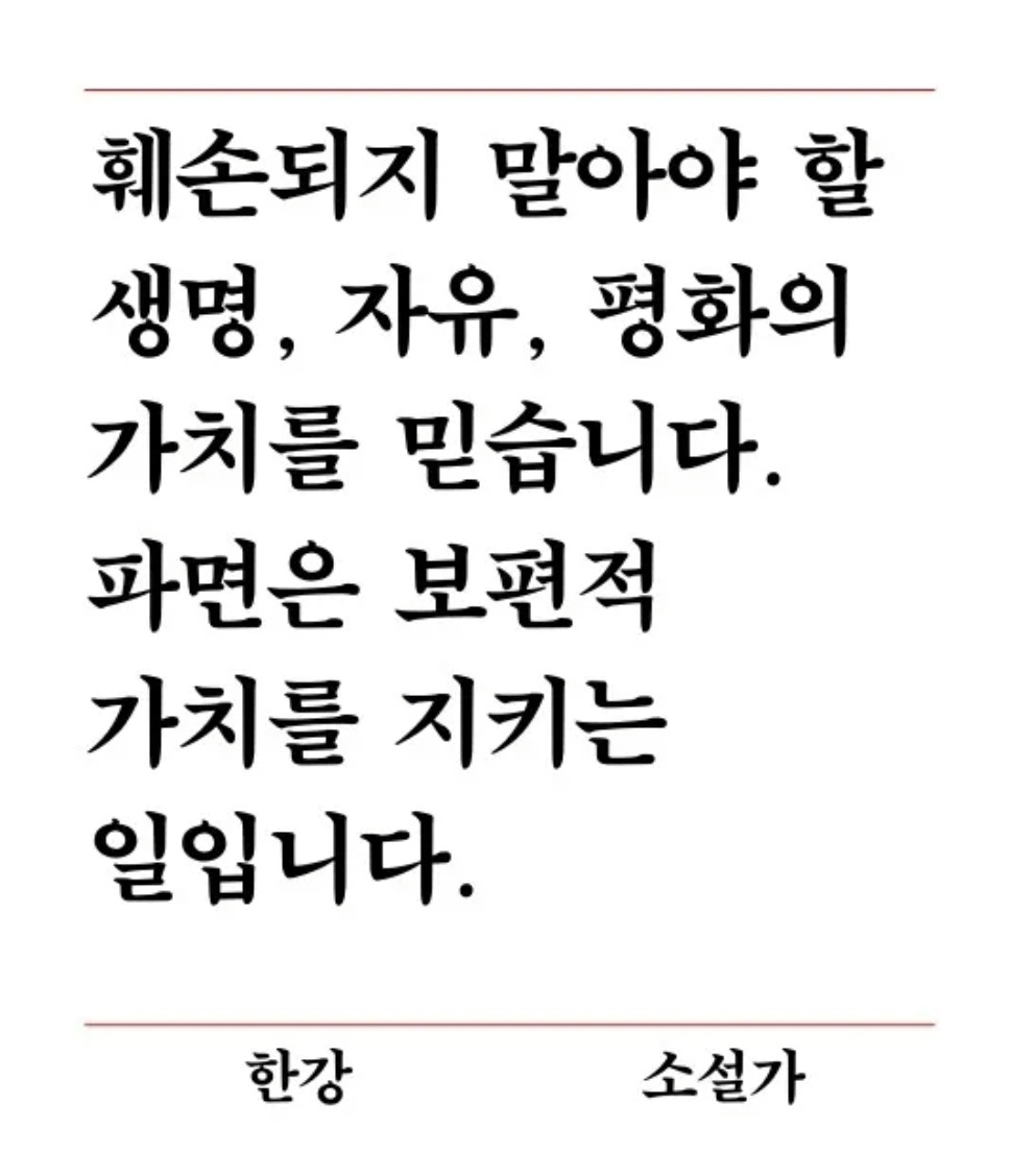 소설가 한강: “훼손되지 말아야 할 생명, 자유, 평화의 가치를 믿는다. 파면은 보편적 가치를 지키는 일”