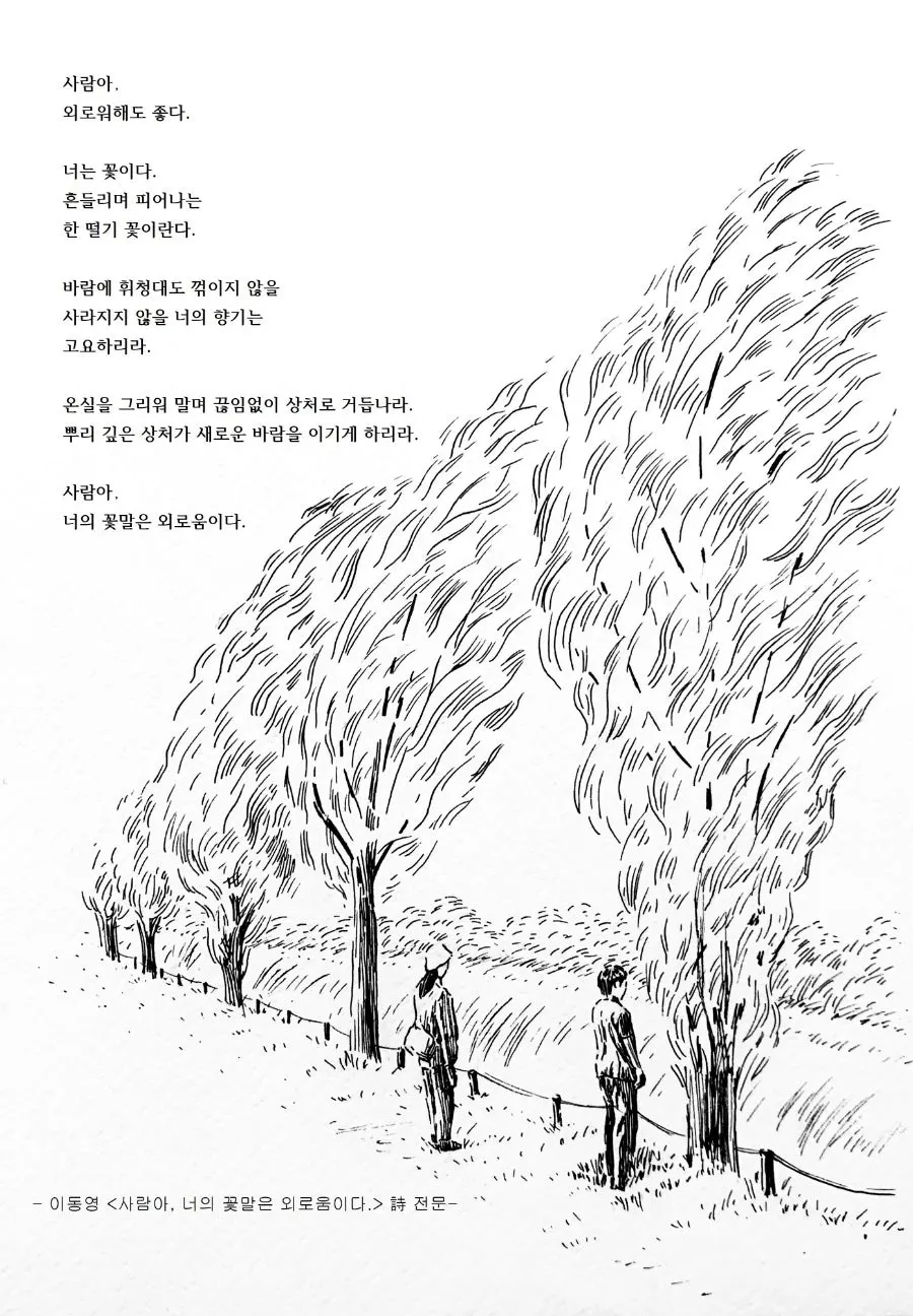 저자가 사람을 꽃에 비유하는 건, 외로움이란 정서가 자신이 피어 있음을 바라봐 주길 바라는 열망의 이면이라는 이유에서이다. ‘내가 그의 이름을 불러 주었을 때 그는 나에게 와서 꽃이 되었’듯, 자신의 존재감을 타인에게 확인받고자 하는 우리의 꽃말은 외로움이다. 그러나 우리는 이어져 있다. 저마다의 모양과 저마다의 색깔, 저마다의 향기로 채워진 화원 속의 ‘그들 각자’이자 ‘우리 모두’이다.