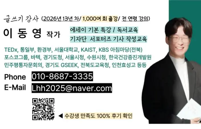 성인 글쓰기 수업부터 10대 청소년 글쓰기 수업까지 전 연령 대상으로 13년째(2026년 기준) 강의하고 있는 이동영 작가입니다.