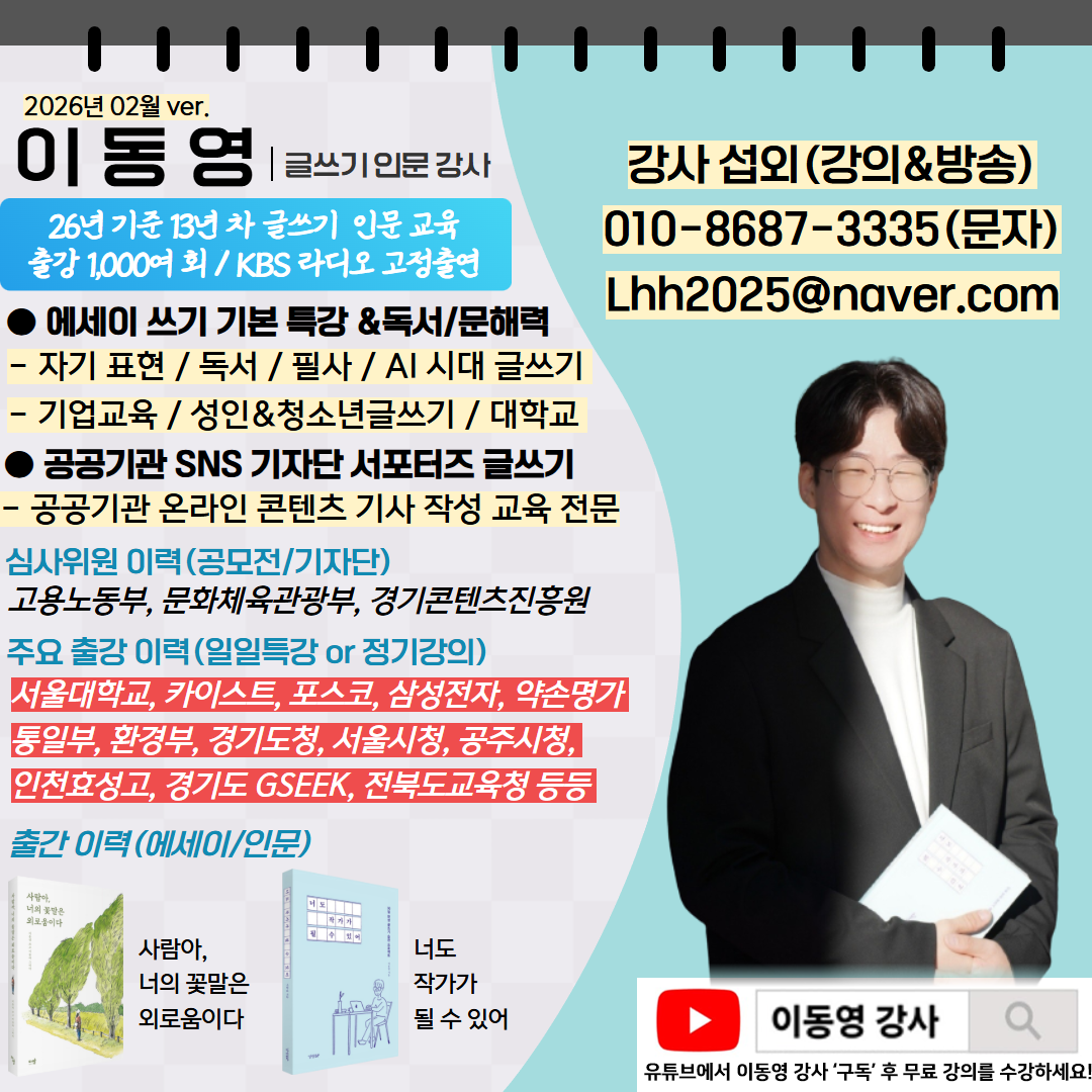 저는 더 많은 사람들이 글 쓰길 바라는 사람입니다. 그런 마음으로 글쓰기 인문 교육을 하거든요. 이제 글쓰기를 제대로 시작하고자 한다면 부디 성급하지 않았으면 좋겠습니다. 충분히 혼자 물장구치는 시간을 거치지 않은 채, 대회에 나가 많은 사람 앞에서 허우적대는 모습을 보여주는 건 바람직하지 않으니까요.