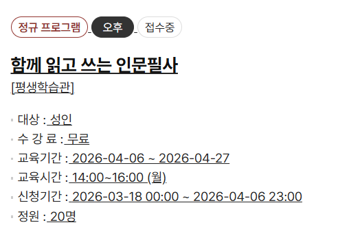 2026년 4월 매주 월요일이고요. 선착순으로 자리가 남아서 신청하실 분이 계시면 지금, 빠르게 신청하시면 되겠습니다.