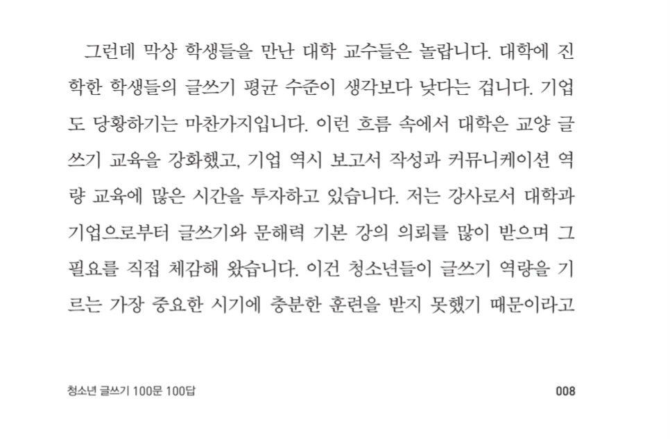 그런데 막상 학생들을 만난 대학 교수들은 놀랍니다. 대학에 진학한 학생들의 글쓰기 평균 수준이 생각보다 낮다는 겁니다. 기업도 당황하기는 마찬가지입니다. 이런 흐름 속에서 대학은 교양 글쓰기 교육을 강화했고, 기업 역시 보고서 작성과 커뮤니케이션 역량 교육에 많은 시간을 투자하고 있습니다. 저는 강사로서 대학과 기업으로부터 글쓰기와 문해력 기본 강의 의뢰를 많이 받으며 그 필요를 직접 체감해 왔습니다. 이건 청소년들이 글쓰기 역량을 기르는 가장 중요한 시기에 충분한 훈련을 받지 못했기 때문이라고...(이하 생략)