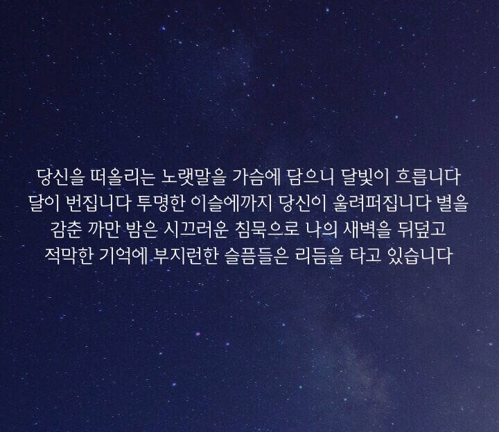 당신을 떠올리는 노랫말을 가슴에 담으니 달빛이 흐릅니다. 달이 번집니다. 투명한 이슬에까지 당신이 울려퍼집니다. 별을 감춘 까만 밤은 시끄러운 침묵으로 나의 새벽을 뒤덮고 적막한 기억에 부지런한 슬픔들은 리듬을 타고 있습니다.