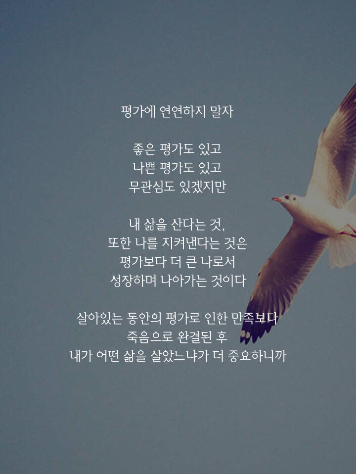 p.s: 글을 읽어주시는 독자여러분의 성원에 힘입어 곧 한 권의 책이 출간될 예정입니다. 짧은 글을 엮은 책이며 제목은(가제) 이 곳 브런치 독자님들이 가장 많은 표를 주신 '나에게 하는 말'이 될 예정입니다. 출판사와 계약을 해서 5월 출간을 목표로 앞두고 있습니다. 서점에서 직접 사보시는 분들이 계신다면 더 좋겠지만, 브런치 독자님을 대상으로 출간이벤트도 기획해볼까 합니다.