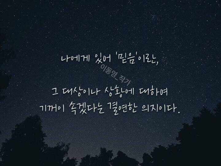 나에게 믿음이란 이런 정의에 근거한다. 마치 사랑이 상처받아도 좋을 대상을 받아들이는 것처럼.